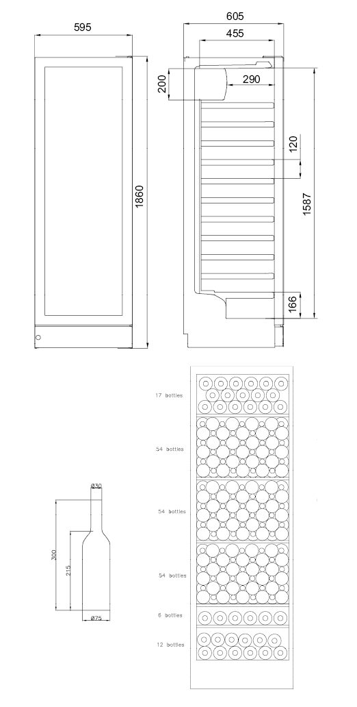 Multizone vinkøleskab 186 cm, 197 vinflasker - Sort front/Sorte sider - 595 x 605 x 1860 mm