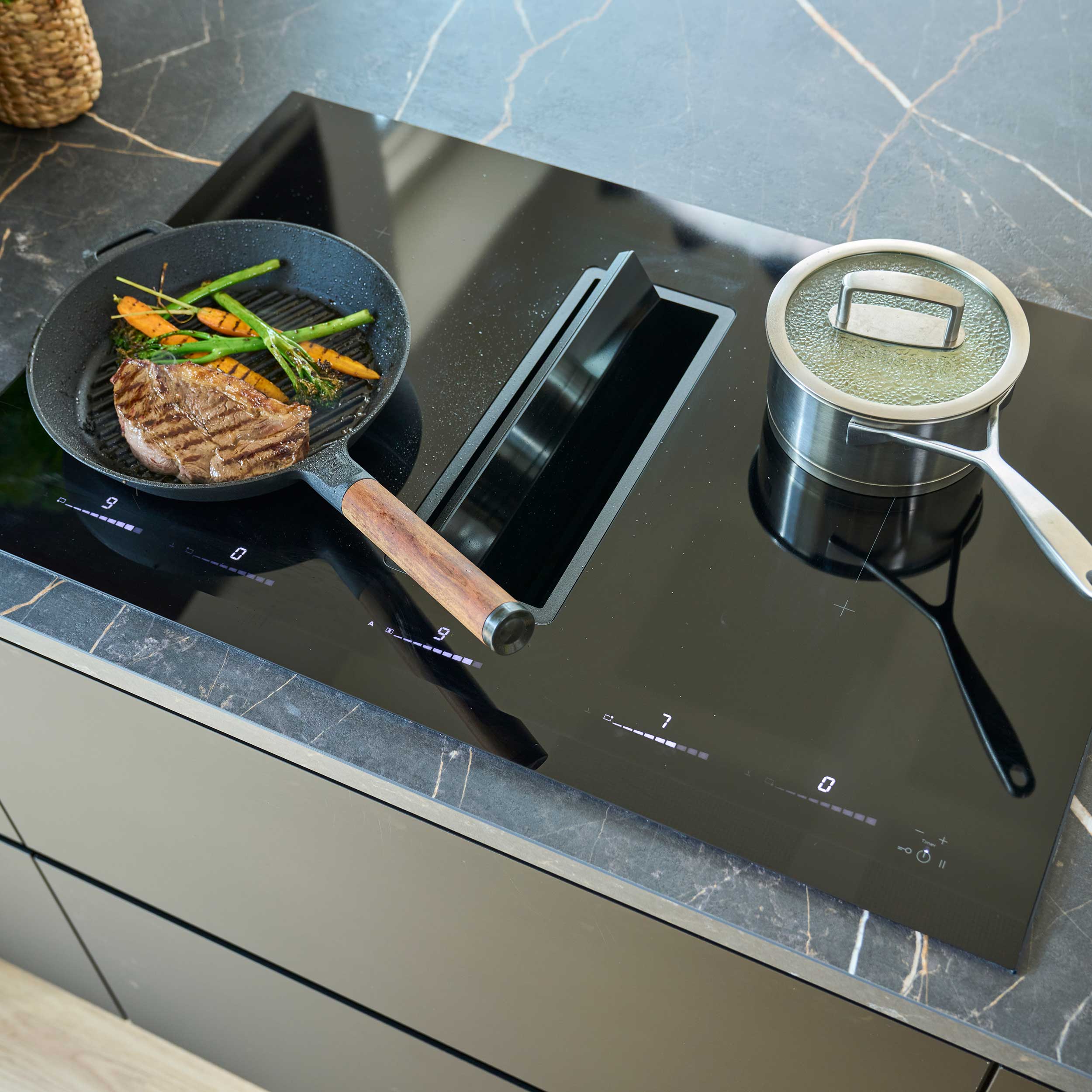 Kogeplade med integreret emhætte. Med intern motor - Total black glas - 786 mm - A++ - For aftræk